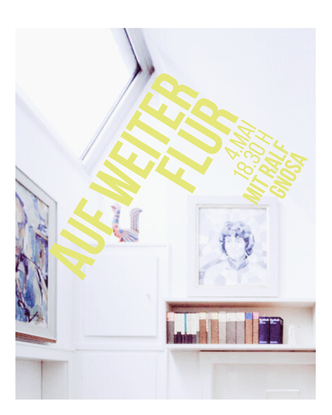 Der Ausdruck „Auf weiter Flur“ entstammt dem Gedicht „Schäfers Sonntagslied“ von Ludwig Uhland und malt das sprachliche Bild eines lyrischen Ichs, welches sich allein „auf weiter Flur“ befindet. Das romantische Motiv der Einsamkeit wird in dem Projekt dadurch aufgegriffen, dass der Flur des Dichterhauses als Lesebühne fungieren soll und die Dichter*innen alleine auf der Bühne stehen, während das Publikum in den Zimmern des Dichterhauses verteilt sitzt und den Worten lauscht. Die Dichterinnen und Dichter befinden sich dann wortwörtlich „auf weiter Flur“- auf dem Flur des Dichterhauses.